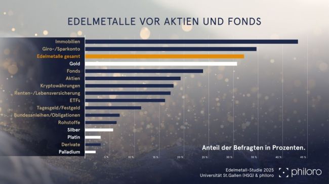 Edelmetalle bleiben für Schweizer Anlegerinnen und Anleger attraktiv: In der aktuellen «Edelmetall-Studie 2025» der Universität St.Gallen und des Edelmetallhändlers Philoro belegen sie erneut den dritten Platz auf der Beliebtheitsskala – mit einem Zustimmungswert von 31,8 Prozent und einem Plus von 3,6 Prozentpunkten gegenüber dem Vorjahr.