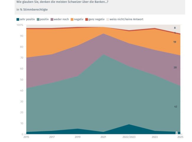 Das Image der Schweizer Banken hat sich seit der Corona-Pandemie spürbar eingetrübt. Während 2021 noch 73 Prozent der Befragten davon ausgingen, dass Banken in der Bevölkerung positiv wahrgenommen werden, sind es 2025 nur noch 44 Prozent. Damit kippt die vermutete öffentliche Meinung erstmals seit 2017 wieder ins Negative. Das geht aus dem am Mittwoch veröffentlichten Bankenmonitor hervor, eine Umfrage, die von GFS Bern im Auftrag der Bankiervereinigung durchgeführt wurde.