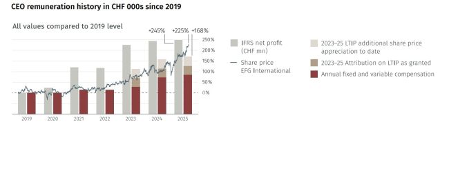 Das Bonusprogramm mit dem Namen LTIP wurde 2023 aufgesetzt, als die EFG-Aktie einen Marktwert von 9,04 Franken besass. Am Stichtag Ende 2025 lag der Preis bei 19,06 Franken. Der Zuteilungspreis ist nicht fixiert, das heisst, der Marktwert der Aktien-Tranchen, die Pradelli von 2026 bis 2028 erhält, könnte niedriger oder auch höher ausfallen.