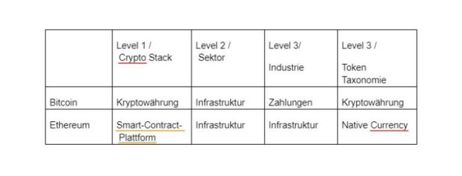 Auf den ersten beiden Ebenen beziehen sich die Autoren nur auf das Netzwerk oder das Protokoll (Crypto Stack), während auf Ebene 3 der Token klassifiziert wird. Am Beispiel des Ethers heisst dies, dass in Level 1 das Netzwerk, also die Ethereum-Blockchain betrachtet wird, auf Level 2 die verschiedenen Segmente der Krypto-Wirtschaft und erst auf Stufe 3 der Token, also der Ether.
