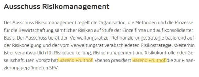 Wörtlich heisst es auf der Website: «Den Vorsitz hat Barend Fruithof. Ebenso präsidiert Barend Fruithof die zur Finanzierung gegründeten SPVs.» Der Ausschuss ist für Risikobeurteilung, Risikomanagement und Risikokontrollen der Gesellschaft zuständig.