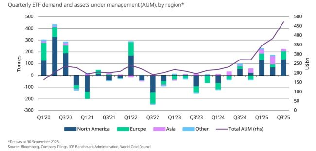 Das Wachstum wurde hauptsächlich durch Investoren getrieben, die im dritten Quartal 537 Tonnen gekauft haben – ein Plus von 47 Prozent gegenüber dem gleichen Zeitraum im Vorjahr. Noch stärker zugelegt haben die Zuflüsse in physisch gedeckte Gold-ETFs: Sie schwollen im dritten Quartal auf 222 Tonnen an. Im Vorjahresquartal lag dieser Wert bei 94,7 Tonnen – ein Zuwachs von 134 Prozent. An der Spitze liegen in Nordamerika kotierte Fonds (346 Tonnen), gefolgt von europäischen (148 Tonnen) und asiatischen Fonds (118 Tonnen).