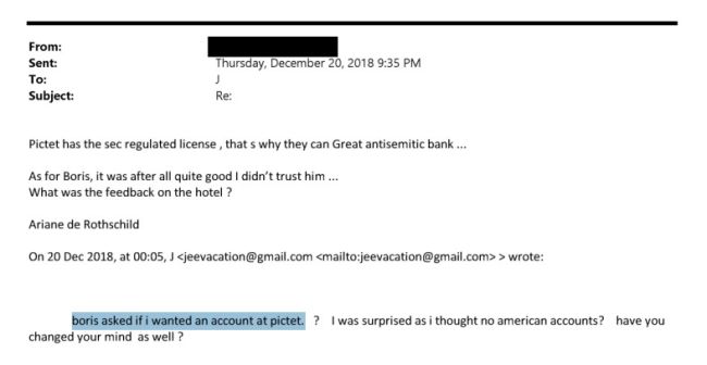 Darauf schrieb sie ihm zurück: «Pictet has the sec regulated license, that s why they can (sic) Great antisemitic bank … As for Boris, it was after all quite good I didn't trust him … What was the feedback on the hotel? Ariane de Rothschild».
