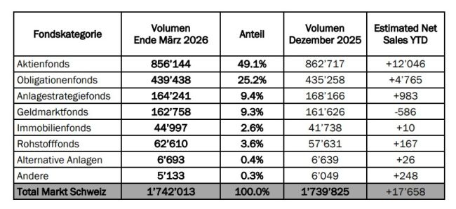 Das Gesamtvolumen des Schweizer Fondsmarkts legte im ersten Quartal leicht auf rund 1742 Milliarden Franken zu – ein hauchdünnes Plus von 2,2 Milliarden. Gleichzeitig flossen netto 17,7 Milliarden Franken an Neugeldern in den Markt, was auf eine grundsätzlich intakte Nachfrage hindeutet, wie der Verband Asset Management Switzerland in einer Mitteilung schreibt.